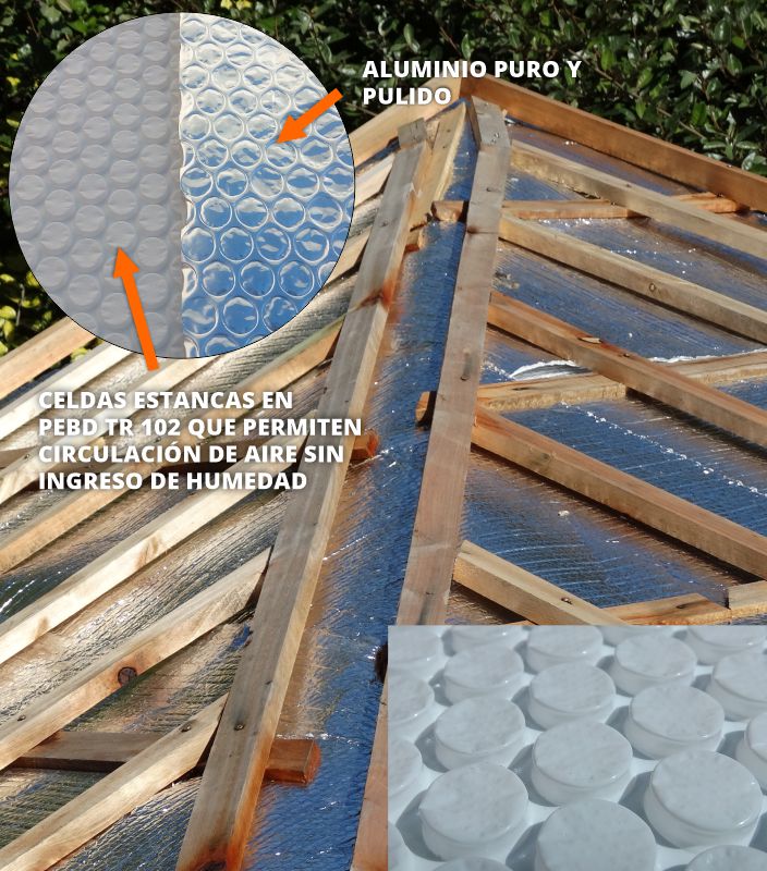 La manta AISLATHERMIC® incorpora celdas de aire estanco en PEBD TR desarrollado en nuestros laboratorios, con aluminio puro y pulido, formando canales internos que permiten una circulación de aire controlado en techos y paredes. Este desarrollo evita la condensación y formación de ambientes húmedos además de la propagación de hongos y plagas, protegiendo eficazmente la madera.